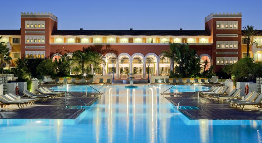 El edificio del hotel recrea un palacio andaluz, con spa y una enorme piscina al aire libre.